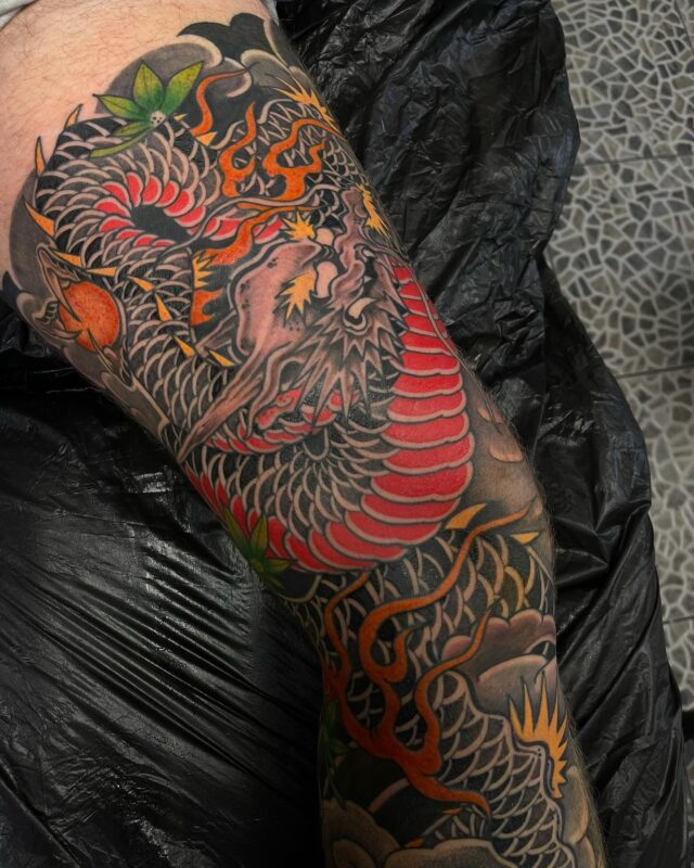 Japanse tattoos zijn rijk aan symboliek en verhalen. Denk aan draken, koi-karpers, tijgers of samoerai, elk met een eigen betekenis zoals moed, kracht of geluk. Deze stijl valt op door de grote, vloeiende composities en het gebruik van krachtige contouren en schaduw. Vaak worden hele lichaamsdelen bedekt, zoals armen, rug of benen. Timothy bij Bijl Tattoo weet deze traditionele stijl perfect te vertalen naar een tattoo die zowel artistiek als persoonlijk is. Met oog voor detail en harmonie in kleur en lijnwerk brengt hij elke mythische scène tot leven op de huid.